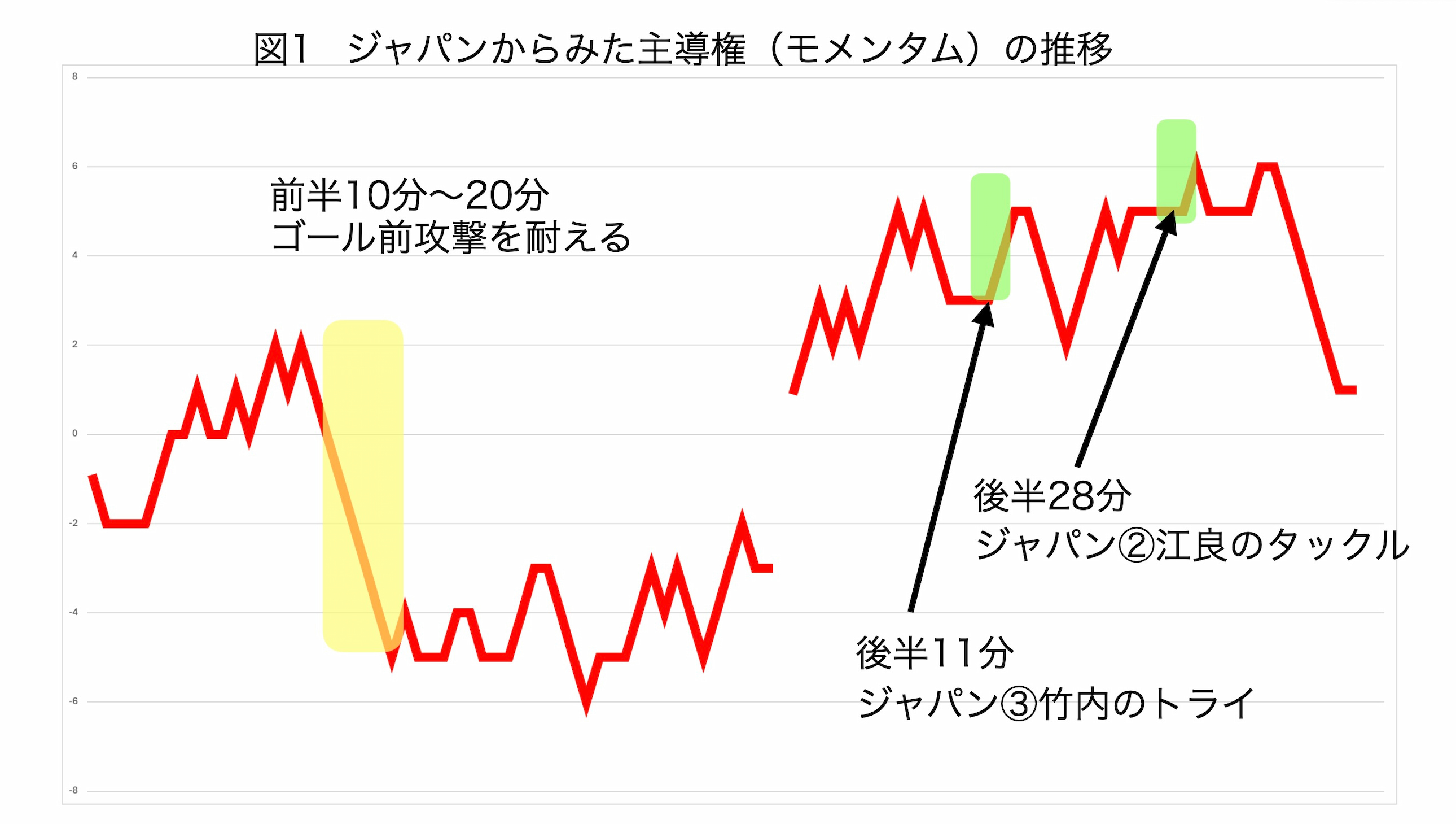 『図1』はゲームの主導権(モメンタム)の推移を可視化したものである。これまでの記事でもモメンタムについては紹介したことがあるが、ポゼッションの結果の成否を得点化し、ジャパンから見たその推移を示している。