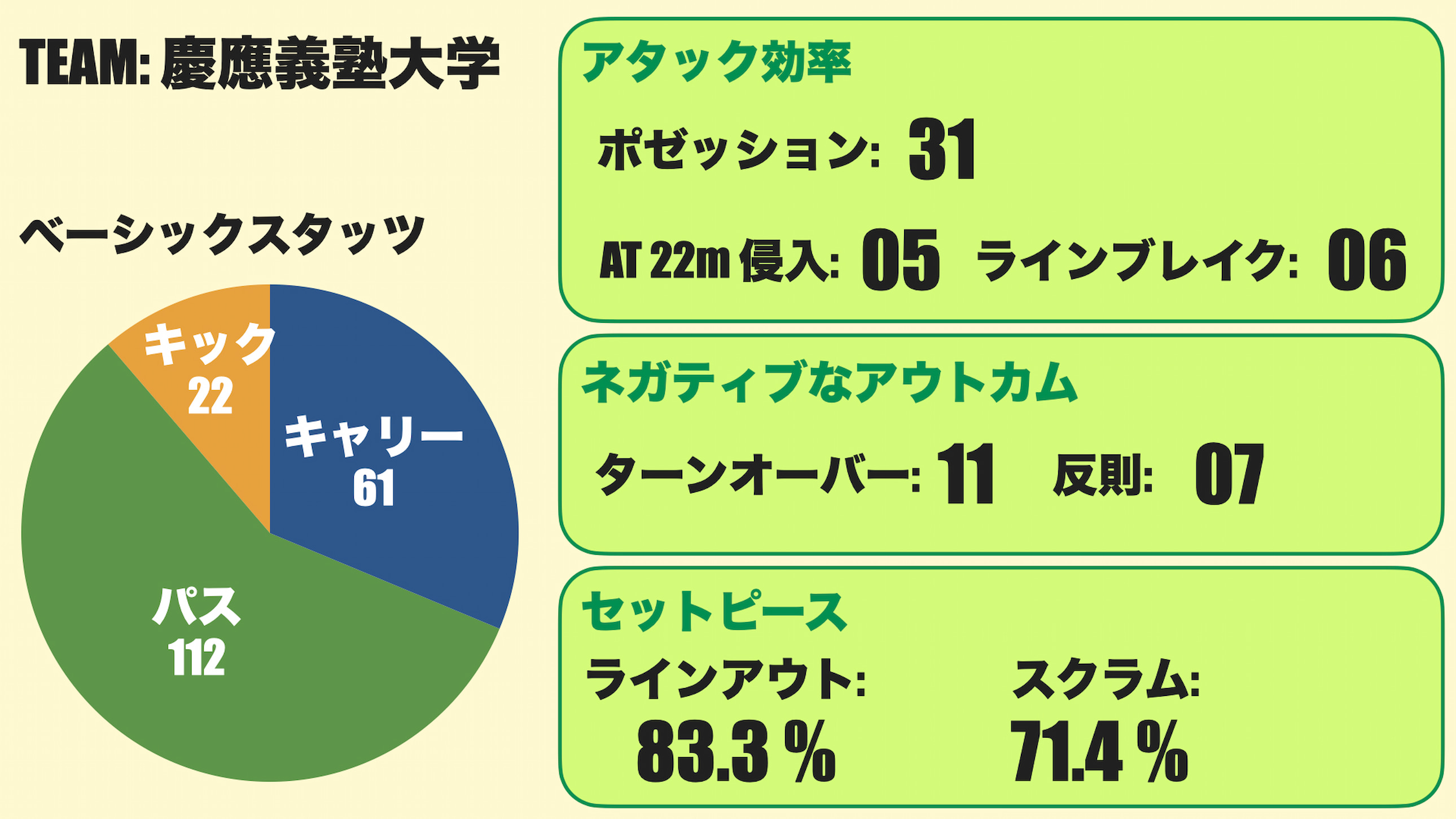 一方で、明確なラインブレイクの回数がポゼッション、キャリーの回数の割に控えめな数値にとどまったところが試合内容の全体的な難しさにつながったかもしれない。ある程度数的優位を外方向に作ることができていたが、慶大のディフェンスのエッジの安定感により、大きなブレイクは抑えられていた。