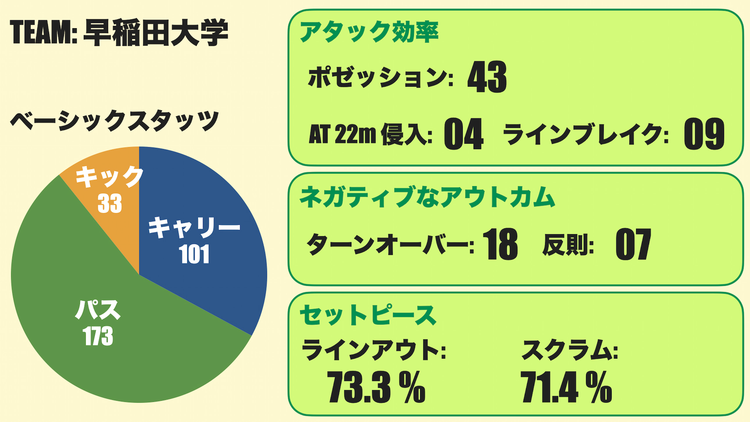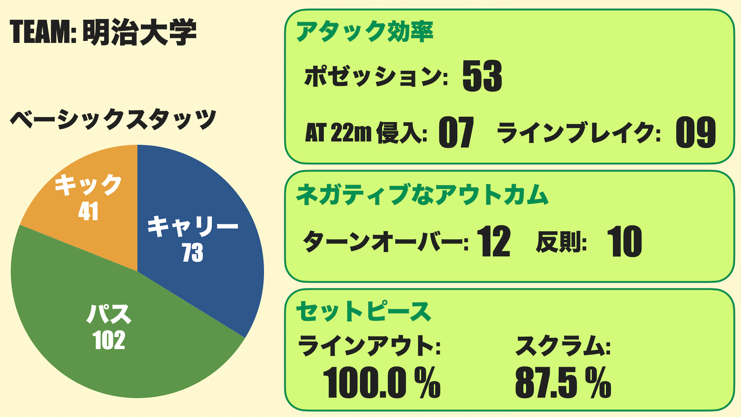 ポゼッションは53回と、非常に多かった。早大と合わせると96回のポゼッションとなり、80分間の平均値で言うと、少しポゼッションが多めだった。キック回数が多かったことも影響しているだろう。