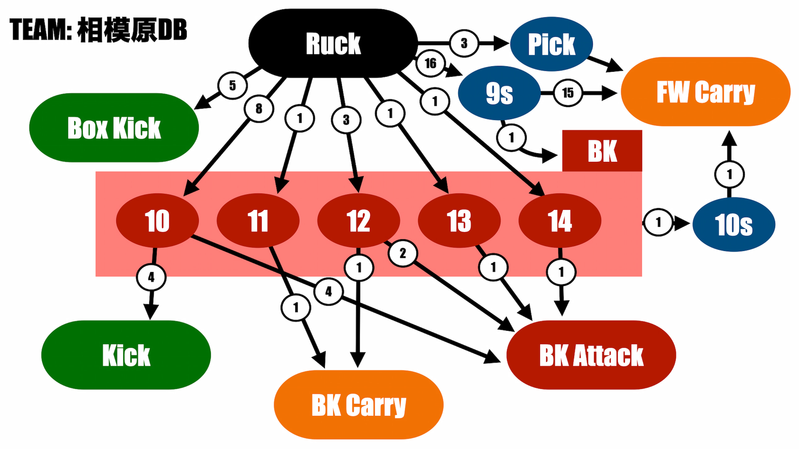 10シェイプの回数も少し多い。普通のチームであれば、平均的な数値として6〜7回。チームのポゼッションに比例するように10シェイプが増えた。サンゴリアスはプレイメーカーベースのアタックをしているため、10シェイプが好まれる傾向にある。