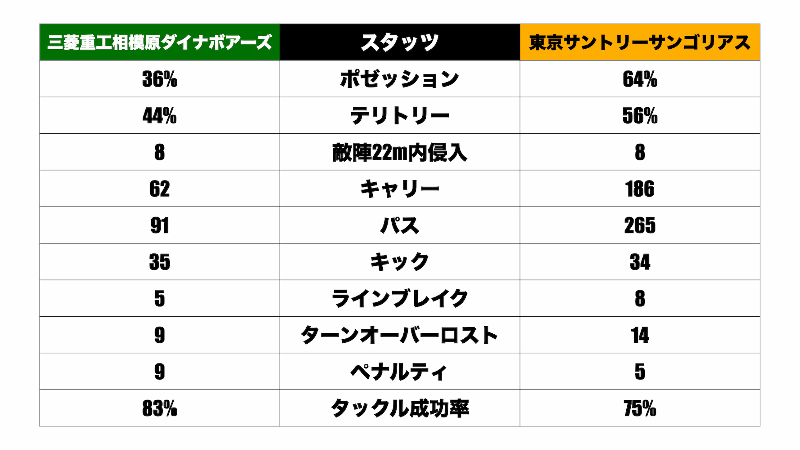 タックル成功率にも大きな差がある。ダイナボアーズの83パーセントという数値も特別高いわけではないが、サンゴリアスは75パーセントだ。