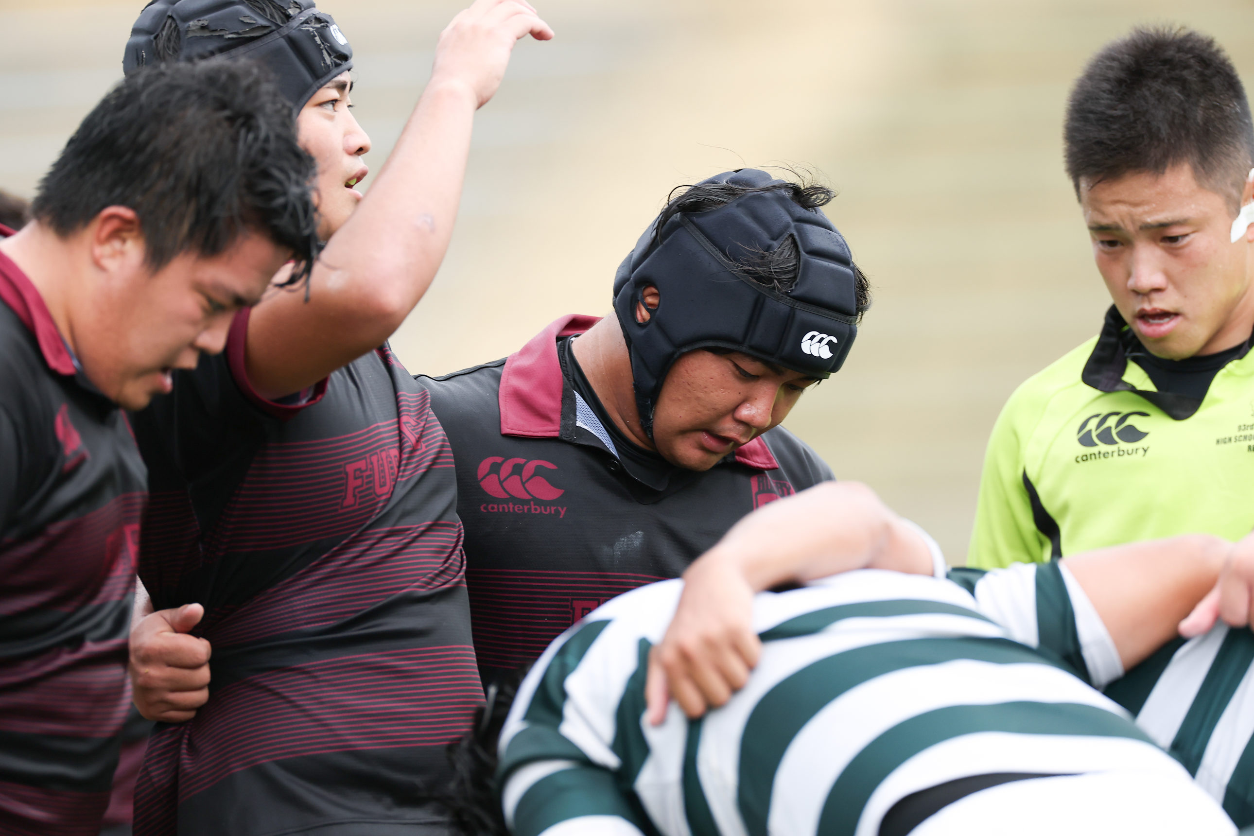 西南学院大学戦、1番のジャージーを着ていた古賀は、後半は右プロップの位置に入った。福大はその最初のスクラムでコラプシングを取られる。