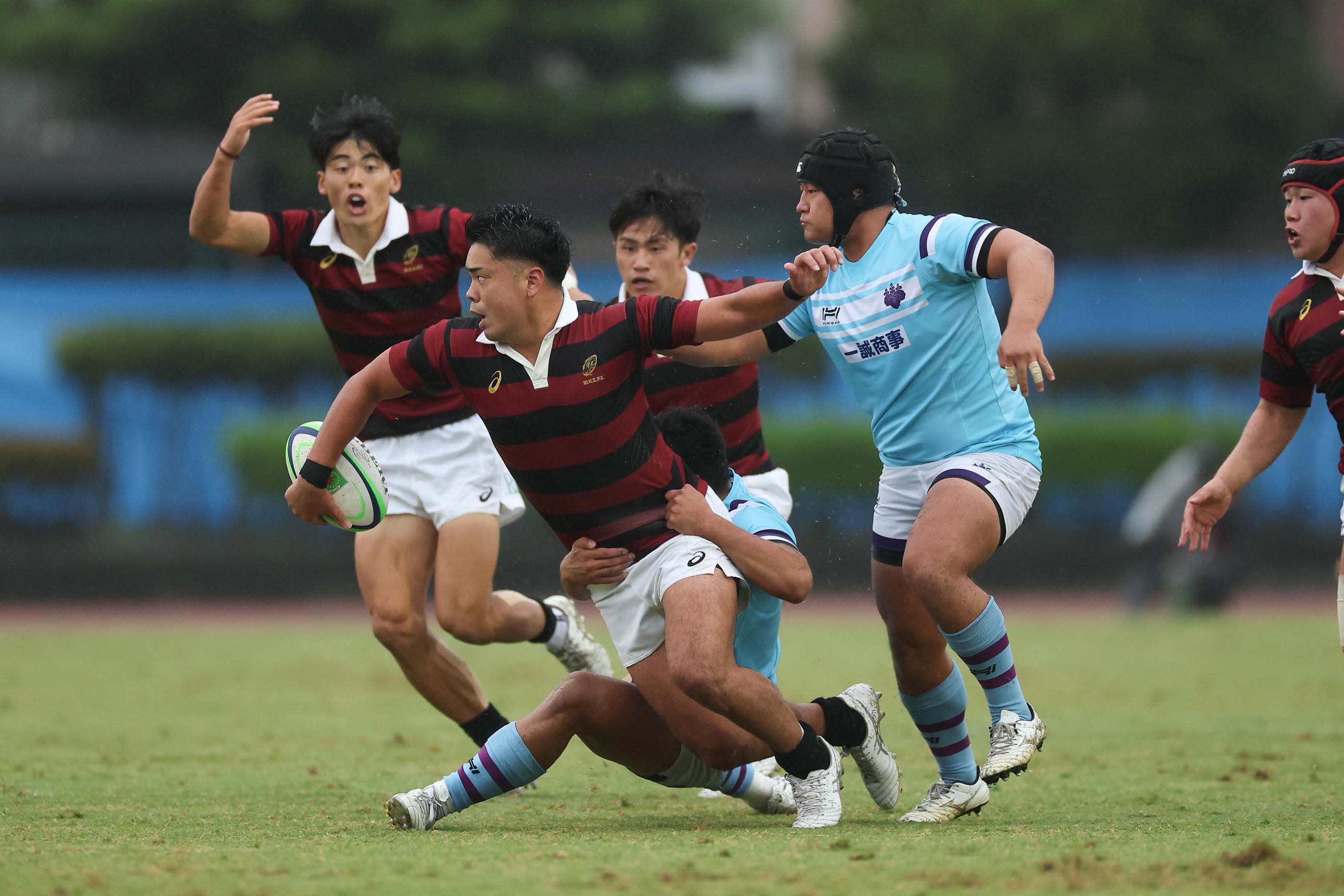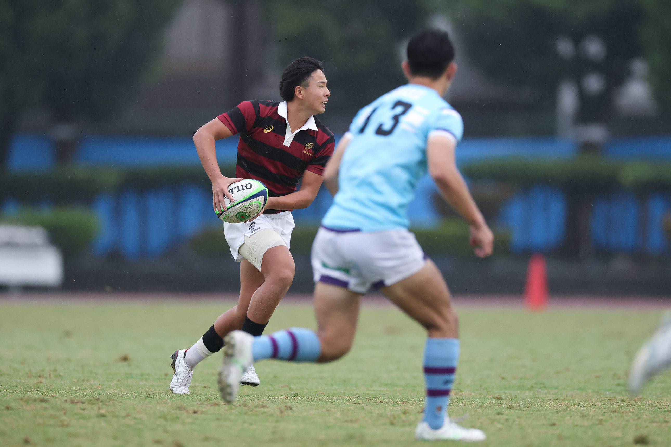 9分、ラインアウト後の乱れたボールをPR杉本安伊朗がインゴールで押さえ、CTB野中健吾がコンバージョンを決める。7-3とした赤黒のジャージーは、背中から風を受けて優位に試合を進めた。