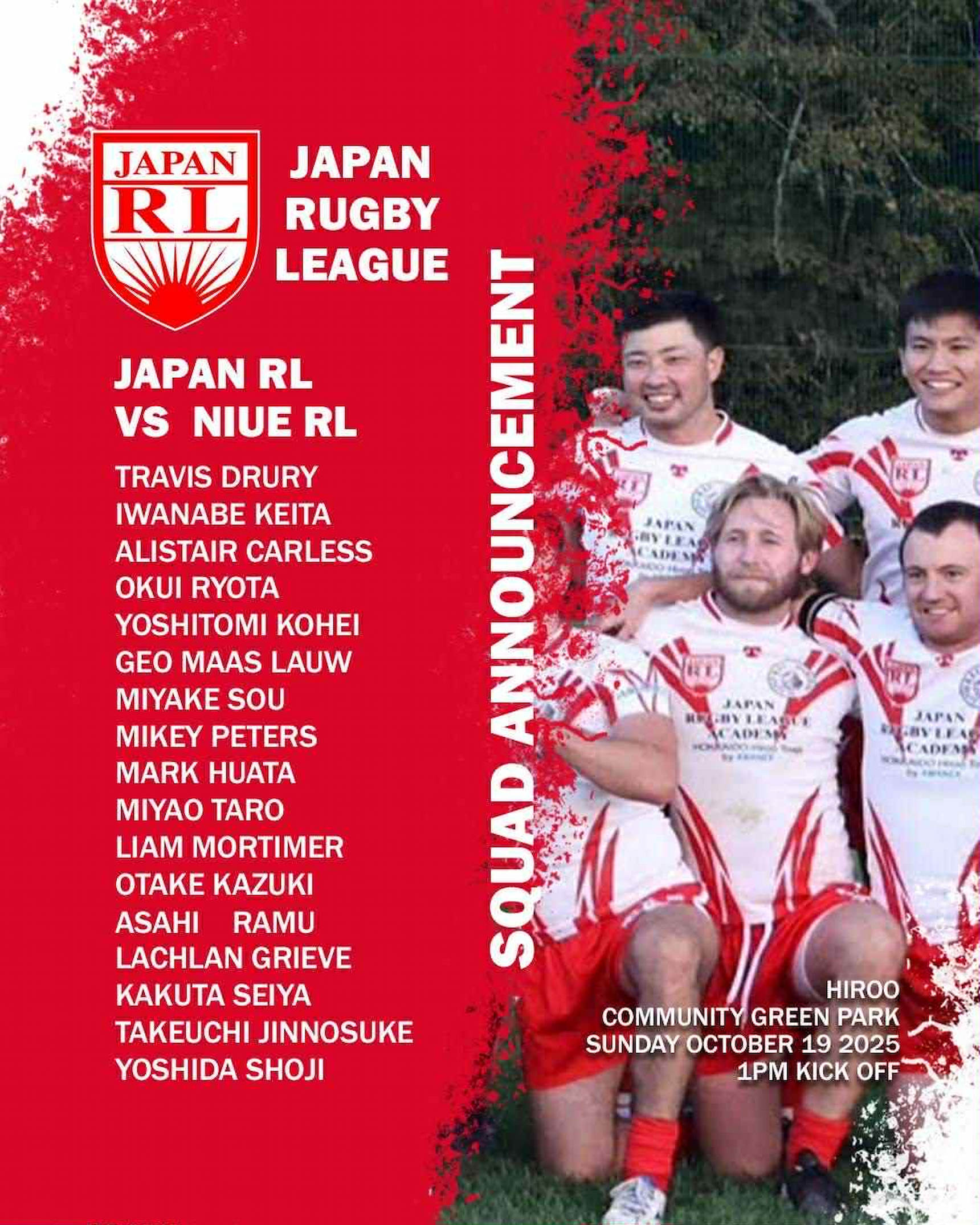 10月19日に行われる13人制ラグビー、ニウエ代表戦の日本代表のメンバー