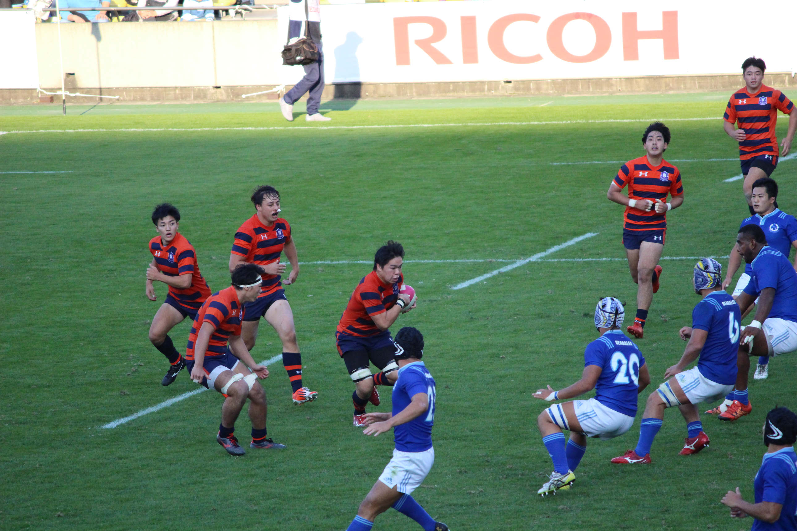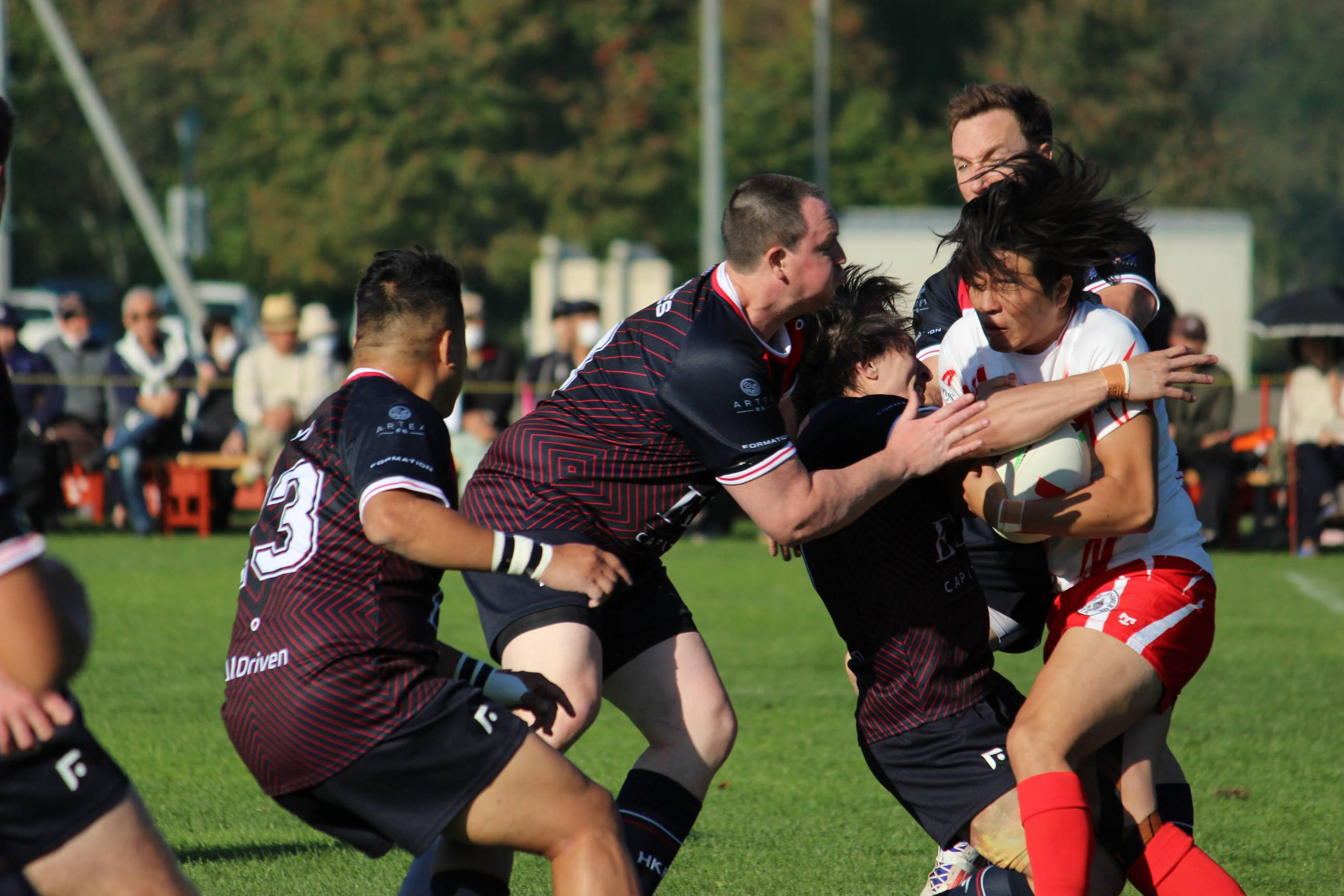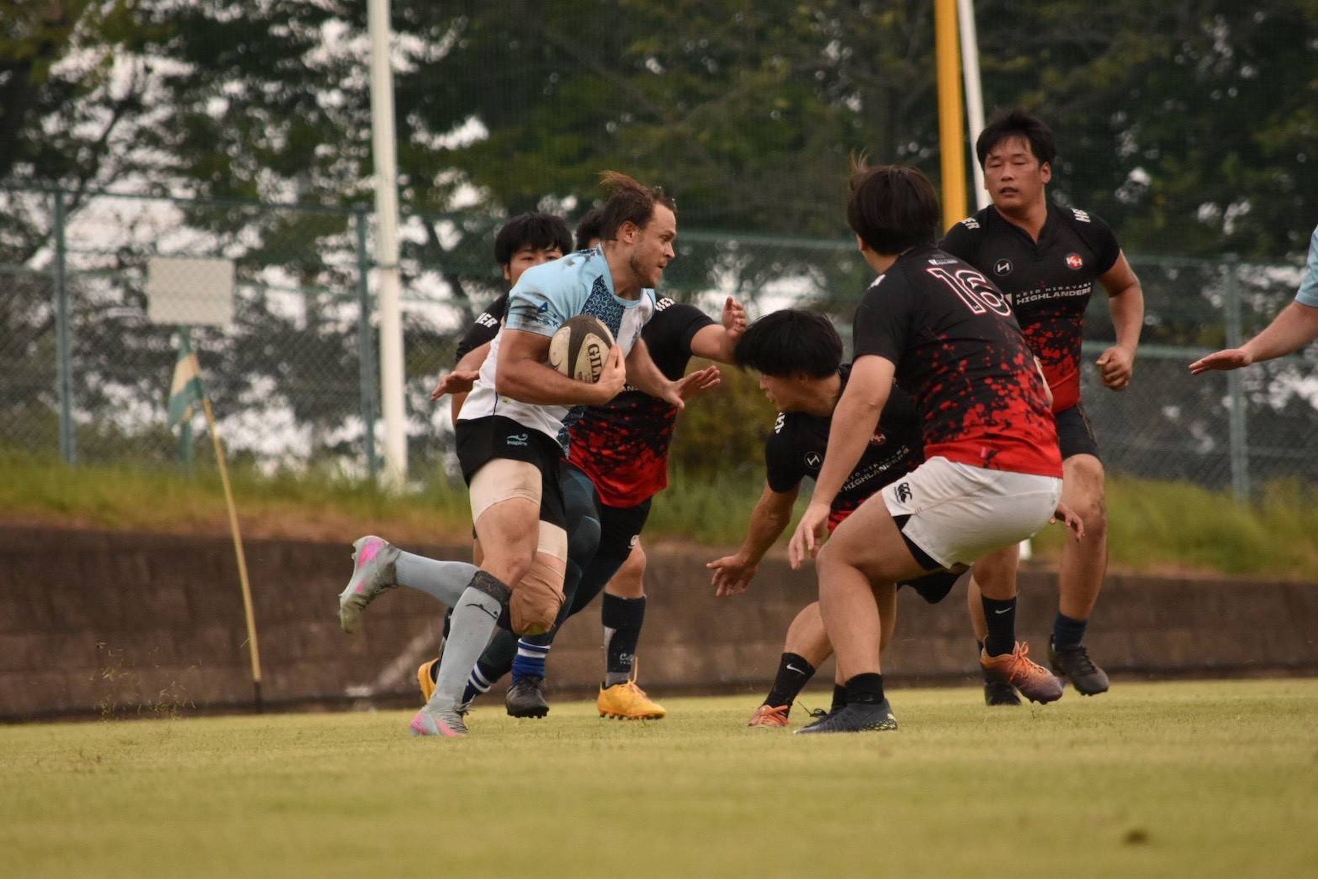 同じく香港戦より、コンタクトの場面。このように胸部へのコンタクトも多い一方で、膝や足首へのコンタクトが少ない分、足首や膝の捻挫や靱帯断裂は15人制ラグビーより少ない。ボールを持っているのは宮尾太郎。ネパールなどアジアでのラグビー普及に尽力されている宮尾泰助さんの息子。その左が、Lachlan Grieve。関西弁話者のオーストラリア人