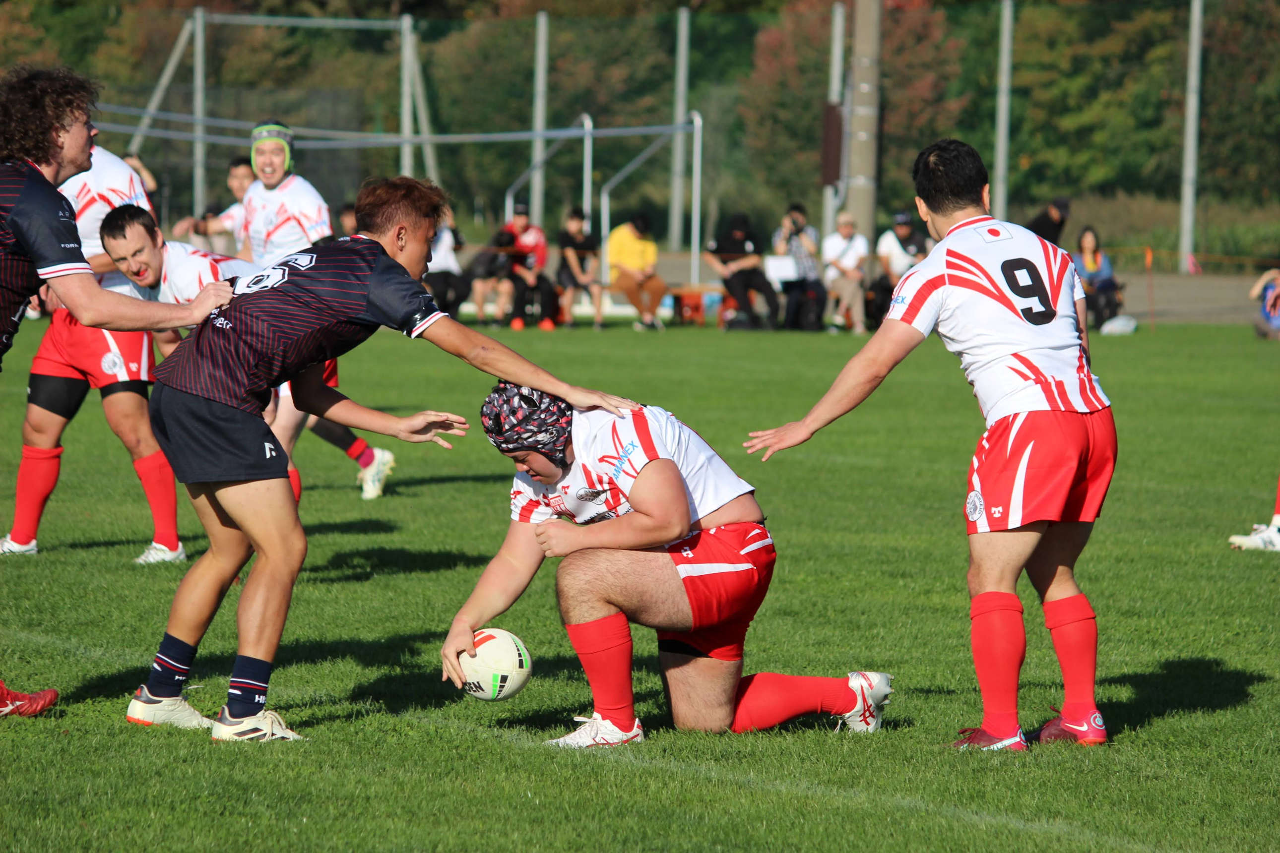 同じく香港代表戦より、香港代表の選手のオフロードの様子。オフロードできず、タックルが成立してしまうと、タックル1となり、6回ある攻撃権のうちの1回を使ってしまう。ゆえにオフロードが頻発する。手前でタックルしているのは、奥井涼太。今回のニウエ戦でもプレーする予定
