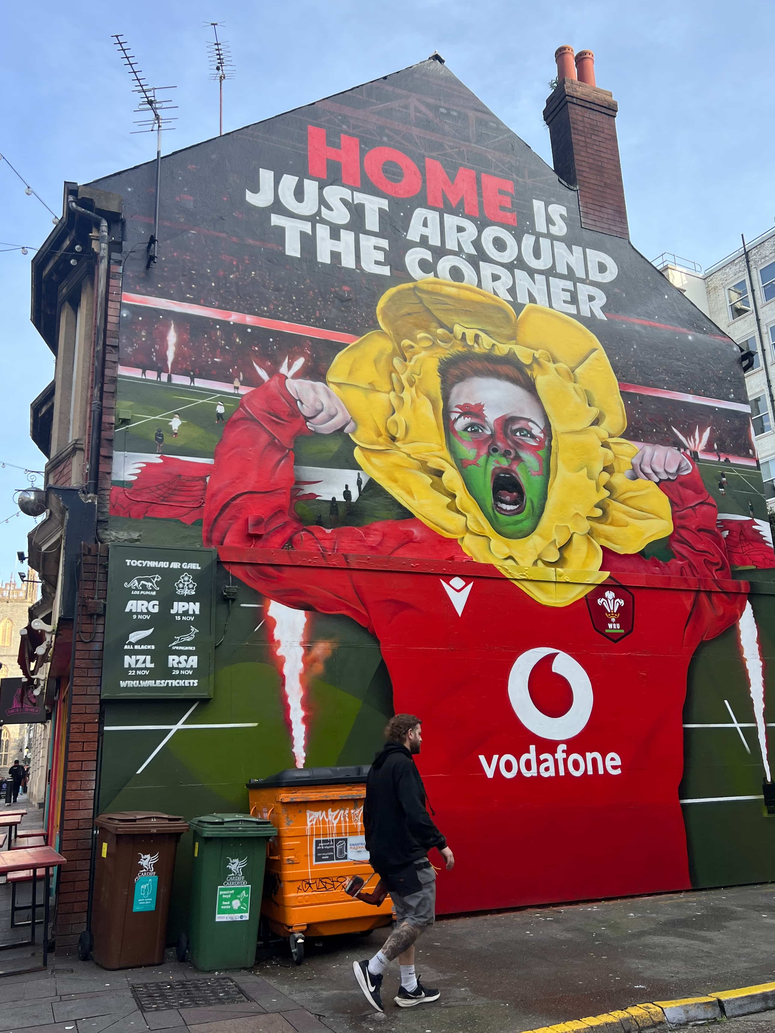 ウェールズは生活の中にラグビーが溶け込んでいる。ウェールズ×日本(11月15日)がおこなわれるプリンシパリティスタジアムは街の中心地からすぐ近く。ショッピング街にはラグビーショップもあり、パブには試合開催の告知ポスターや古いラグビーの写真が飾られ、建物の外壁にラグビーの絵がドーンと描かれているところもあった。