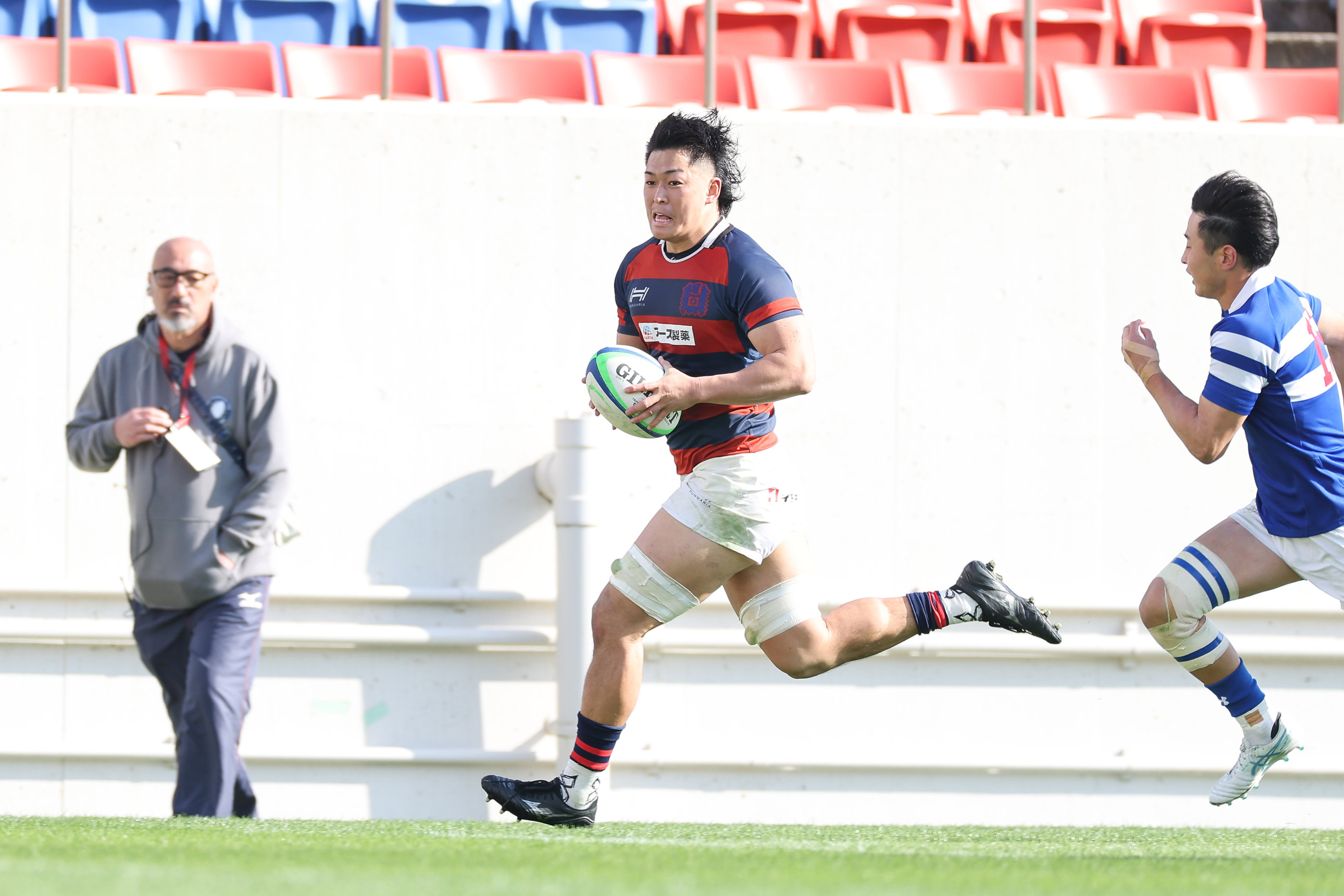 福岡工業大戦の小林は暴れ馬のように豪快に走り、相手を吹っ飛ばした。