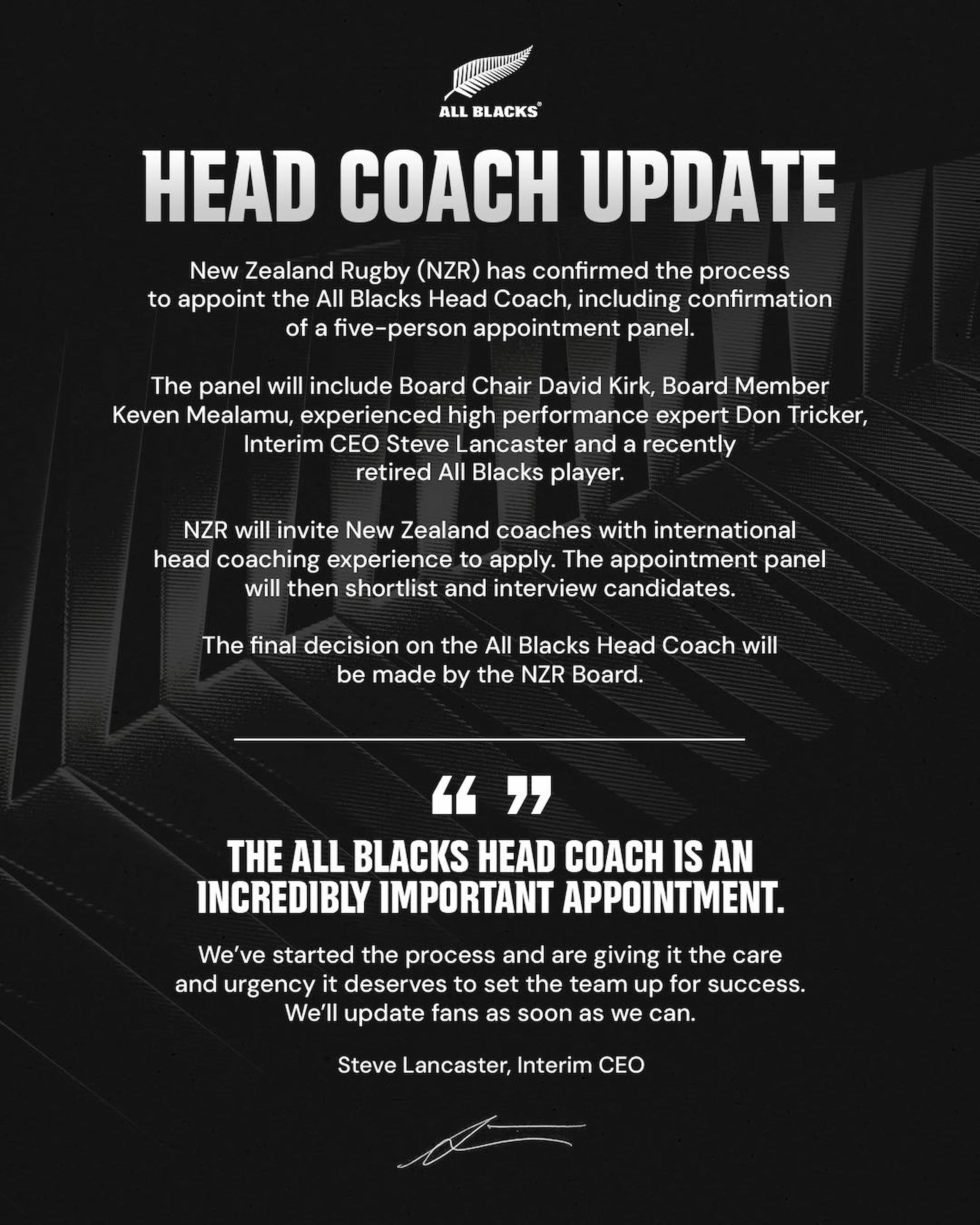 ジョーンズ氏のラジオ出演の翌日の1月26日には、NZRがオールブラックスの新ヘッドコーチ選考プロセスを発表した。5人の選考パネルには最近引退したオールブラックス選手1名が含まれる。また選考基準は、国際レベルでのヘッドコーチ経験を持つNZ人に限定される。最終決定は理事会が下す予定だ。