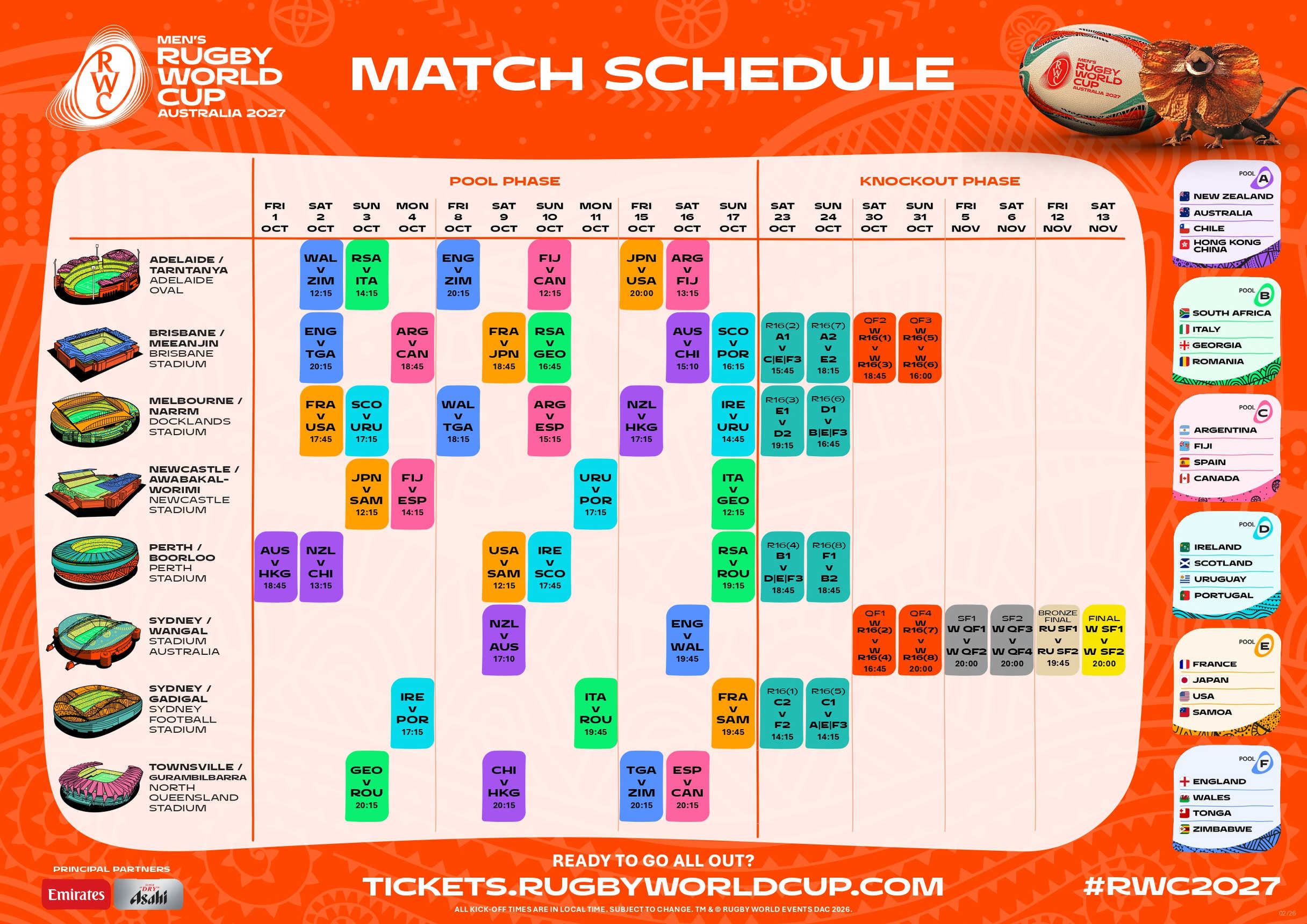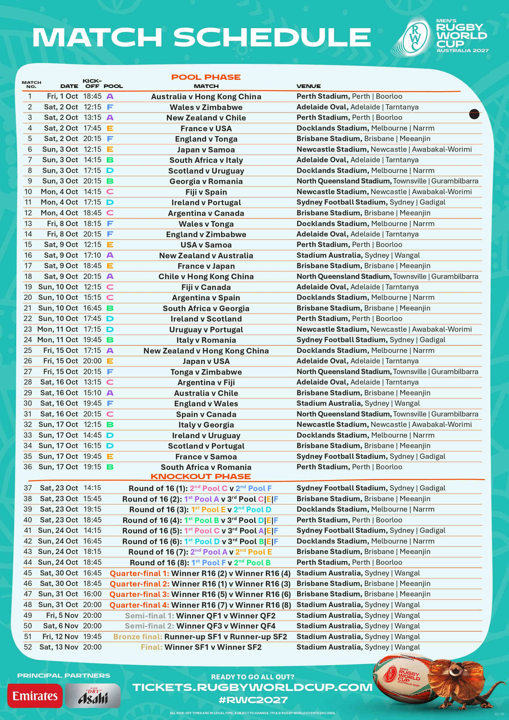 2027年にオーストラリアで開催されるラグビーワールドカップの試合スケジュールが2月3日に発表された。決勝は11月13日(土)、シドニーで20時のキックオフだ。