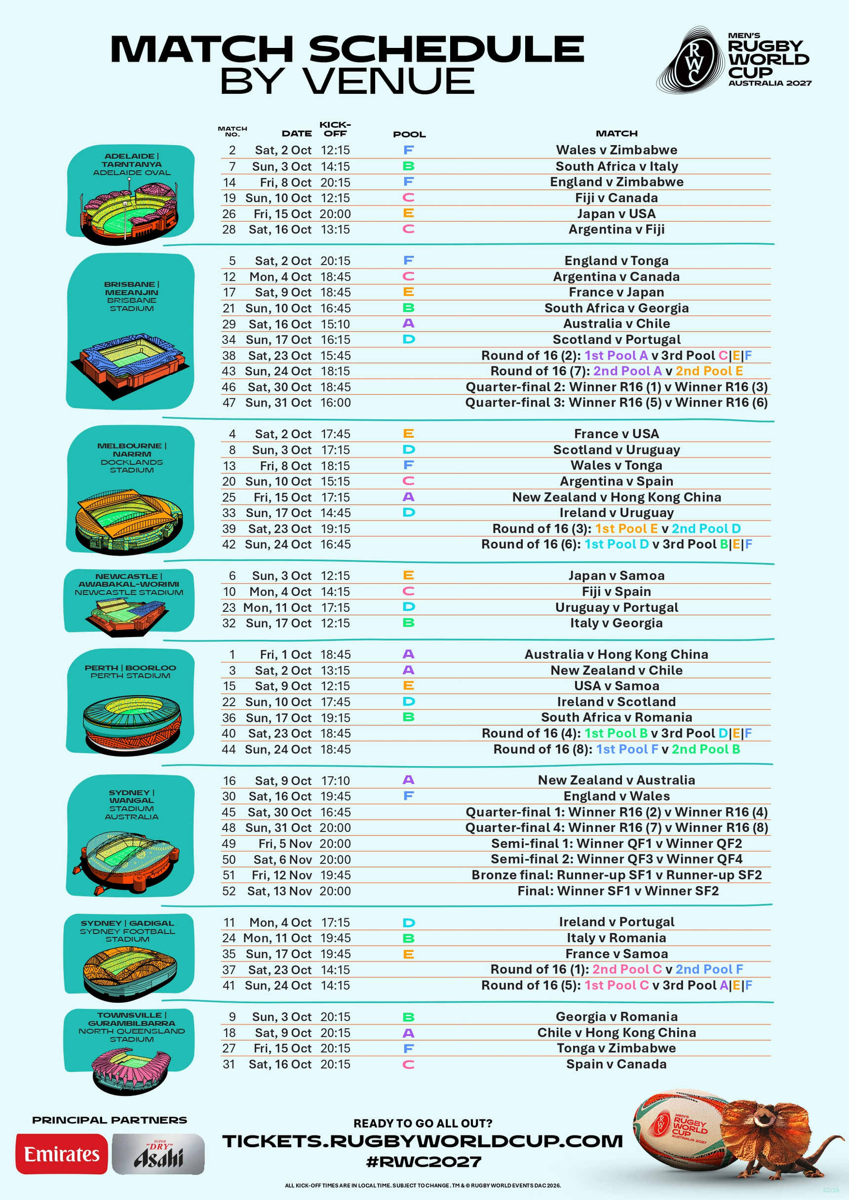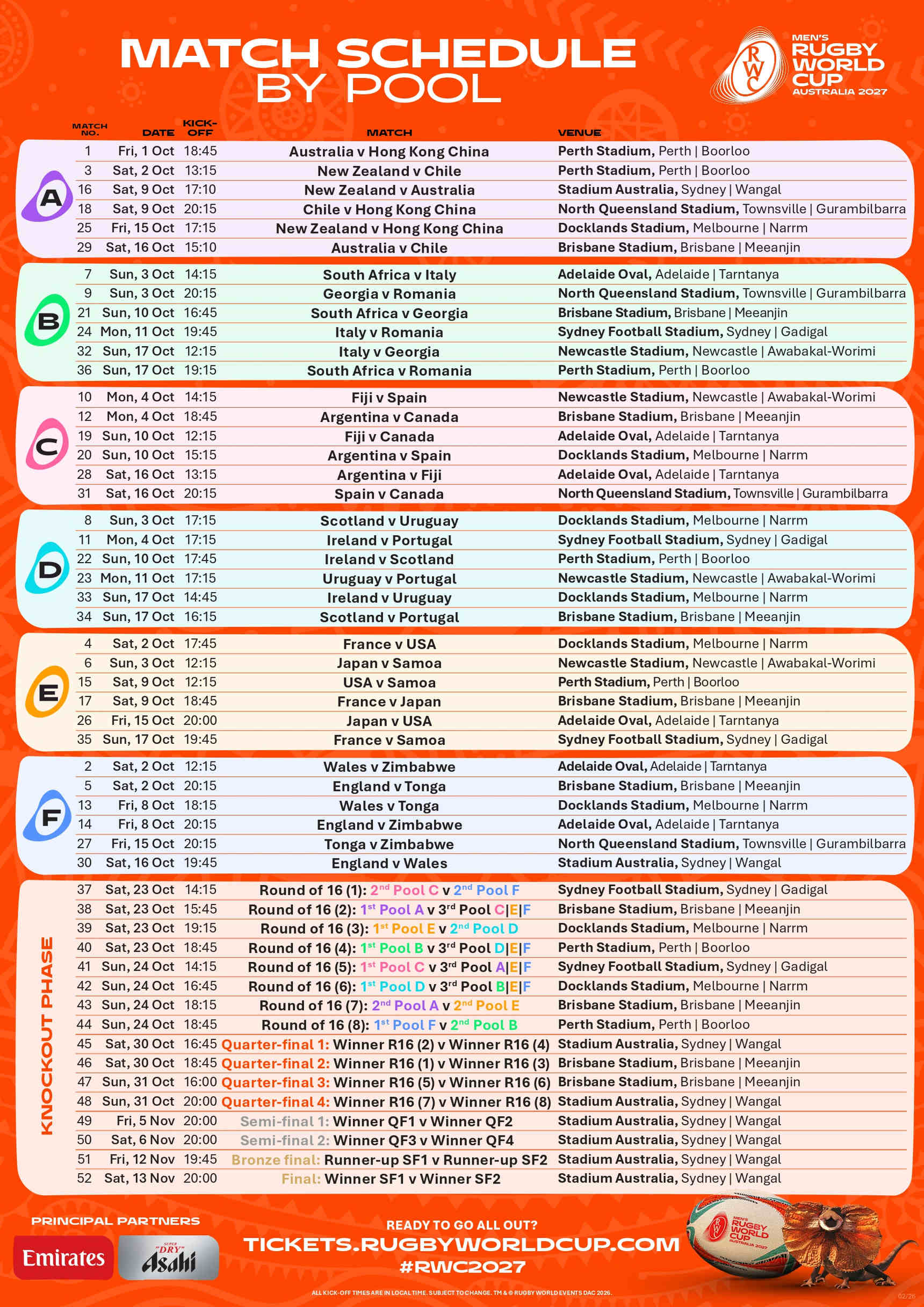 オープニングゲームは2027年10月1日の18時45分にパースでキックオフとなる。カードはオーストラリア×香港だ。