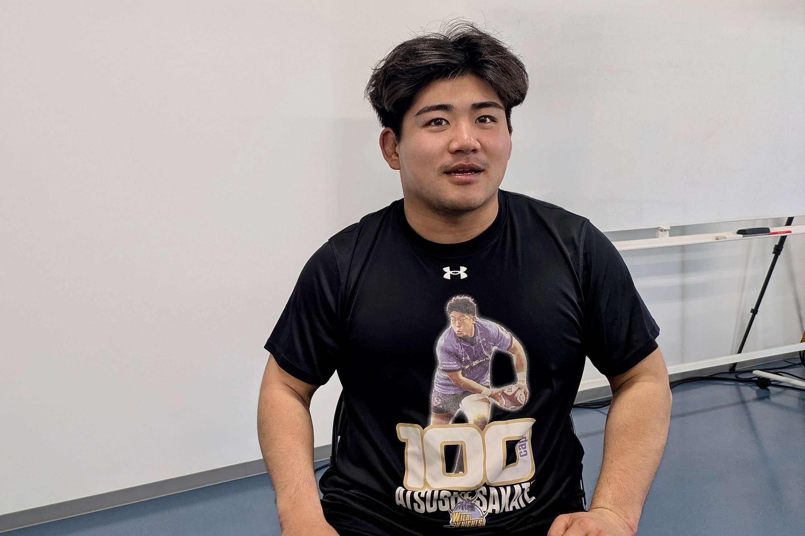 場所は、その日の試合会場となった熊谷ラグビー場の近くのクラブハウスである。同僚のフッカーで、ワイルドナイツの主将を担う坂手淳史の記念Tシャツを着て語った。