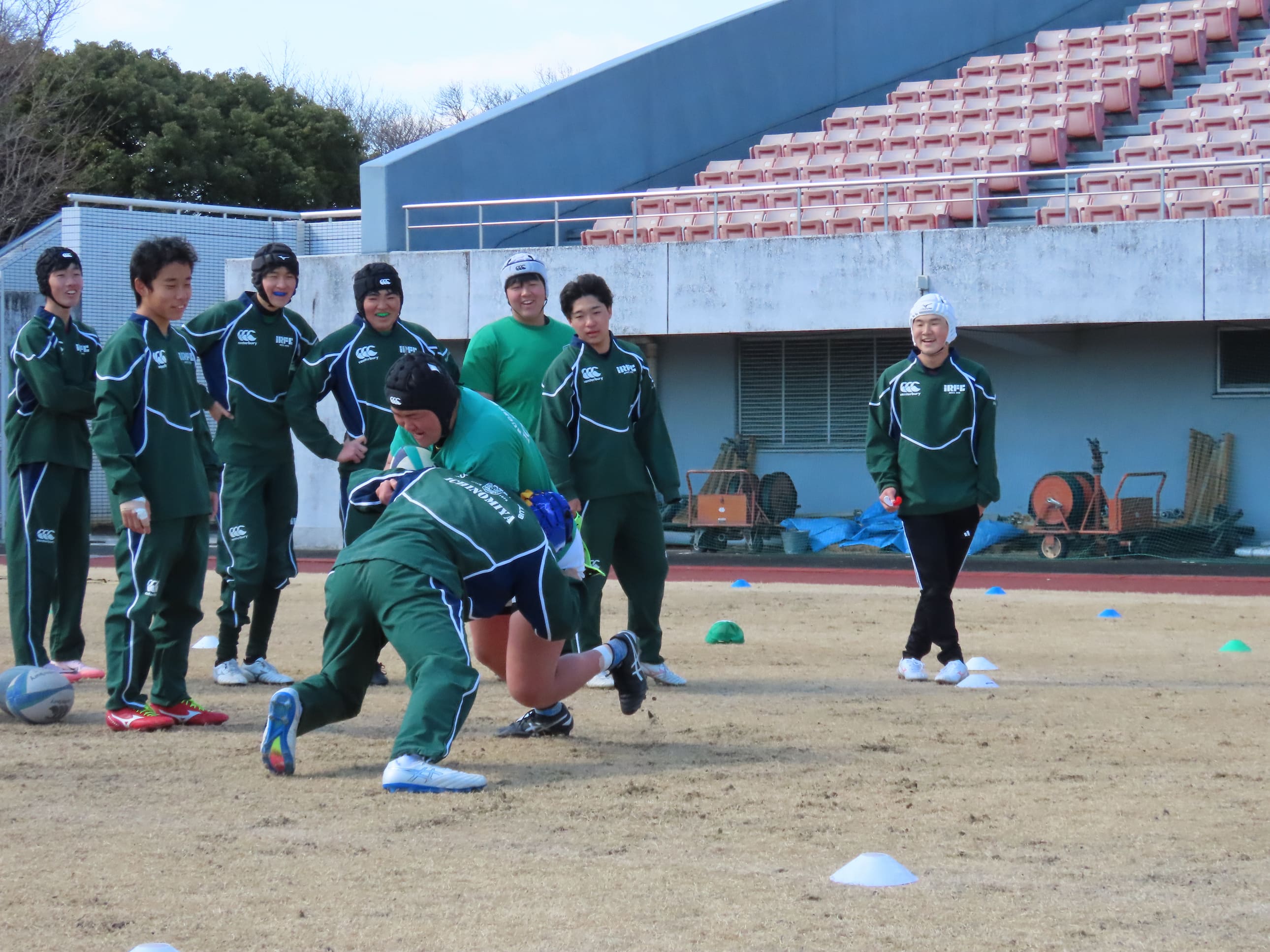 2025年度最後の練習とあり、ピッチ上には活気があった。やはり目を引くのは、この日でスクールを卒業する中学3年生の存在だ。今年も中学3年生に最後の胸を借りるコンタクトセッションがおこなわれ、下級生は必死になってタックルする姿を見せた。