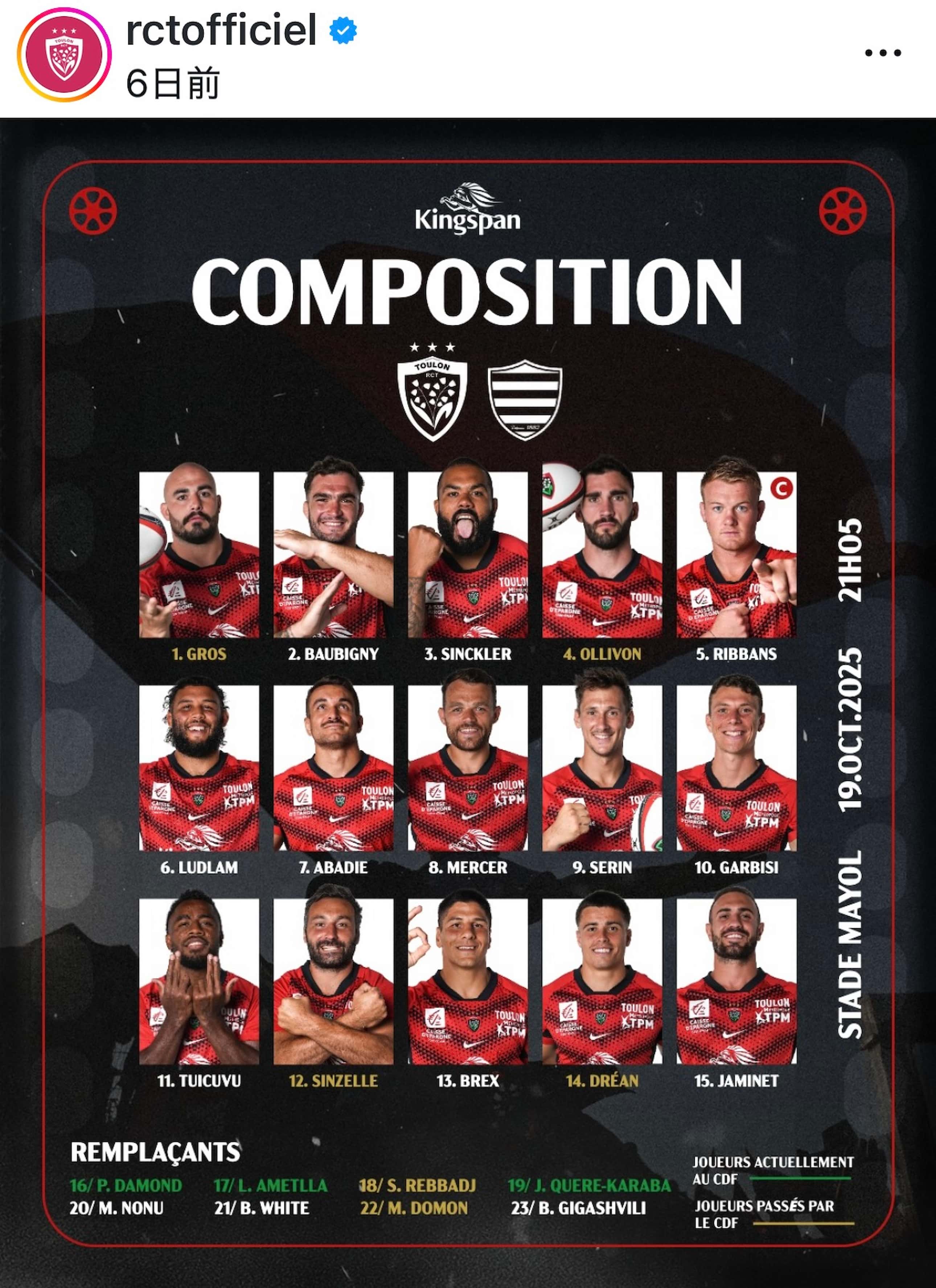 この試合は、今年の1月4日に右膝の前十字靭帯の断裂という大怪我を負ってピッチから離れていたFLシャルル・オリヴォンの復帰2戦目となった。ゲームキャプテンの予定だったLOデイヴィッド・リバンズが体調不調のため欠場することになり、急遽キャプテンに任命されたが、チームの先頭に立ちピッチに入る姿は従来通りの貫禄を感じさせた。カメラが彼の後ろ姿をアップで捉える。背負う番号は「4」。トゥーロンはLOの負傷者が出ていて、少し微妙な状態なのだ。オリヴォンがLOでプレーするのはプロのキャリアでは2度目のこと。前回は2021年5月に遡るが、この日も穴埋め以上の働きを見せ、ミニョニHCは「LOでプレーするためのあらゆる能力を備えている」と称賛し、今後のオプションとして期待を寄せた。