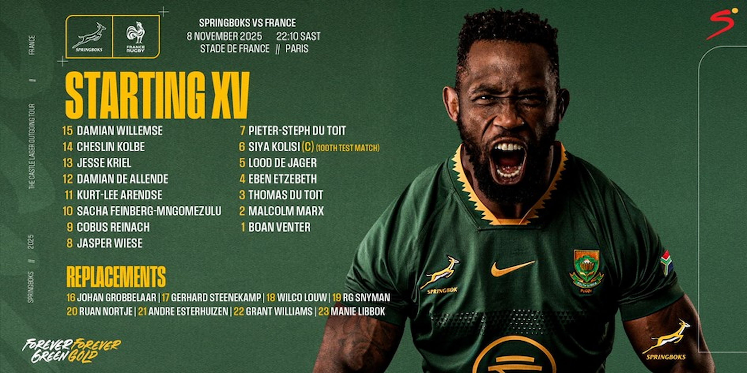 レ・ブルーを迎え撃つスプリングボックスを率いるのは、日本代表戦に続いてキャプテンを務めるシヤ・コリシ。この試合でスプリングボックス史上9人目となるセンチュリオン(100キャップホルダー)入りを果たした。現役選手でこの偉業に到達しているのは、同じくこの試合に出場するLOエツベス(138キャップ)とFBウィリー・ルルー(101キャップ)の2人のみ。