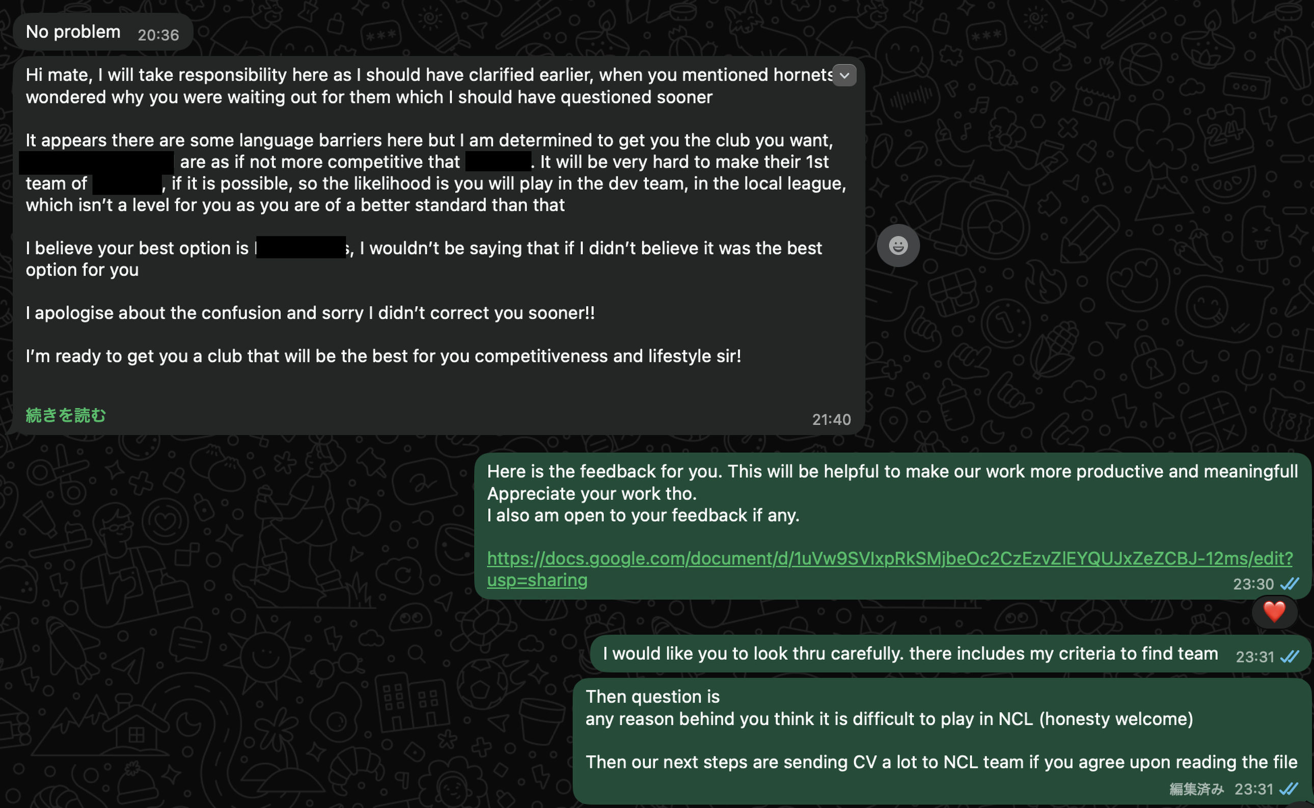 その後、イギリス2部の様々なチームとやりとりしていくも、良い回答を得られなかった。ただその過程で、前出のクラブの練習場やほとんどの試合は、イギリス第2、第3の都市でおこなわれることが分かり、比較的生活のしやすさ(アジア人への寛容度や日本食へのアクセスなど)が得られそうだったから、そこに入ることを一旦決めた。そしてチームのチェアマンと再度会議をすることになった。