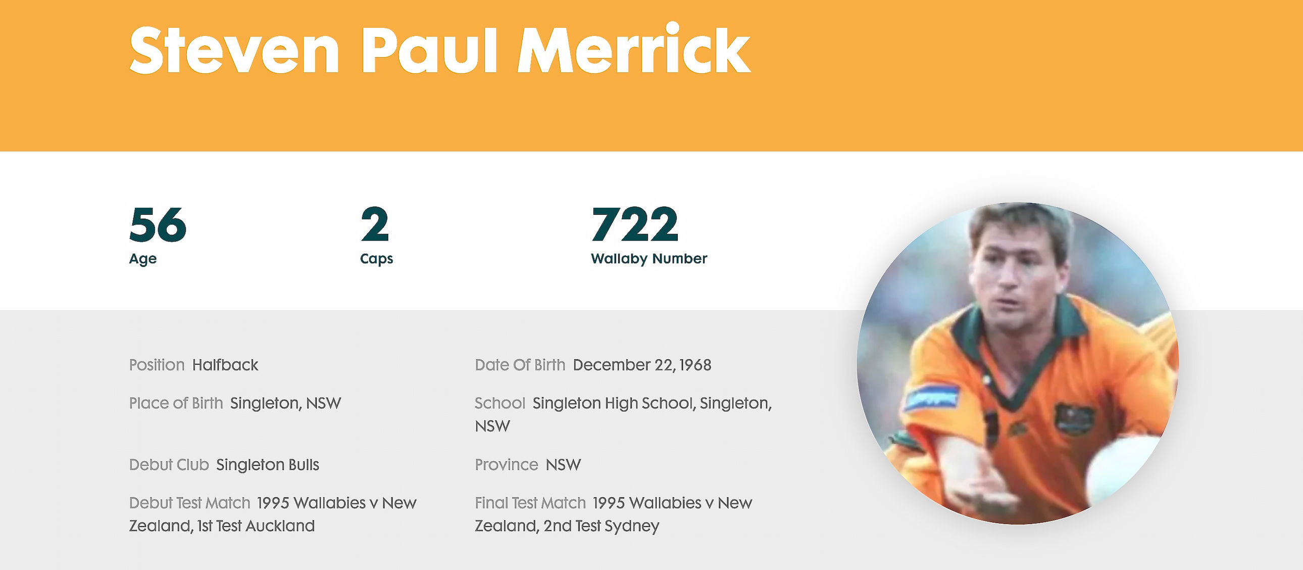 スティーブ・メリック。オーストラリア代表ワラビーズの背番号9で2キャップを手にしている。1995年のブレディスローカップ、オールブラックスとの連戦である。かのジョージ・グレーガンを押しのけてポジションをつかんだ。
