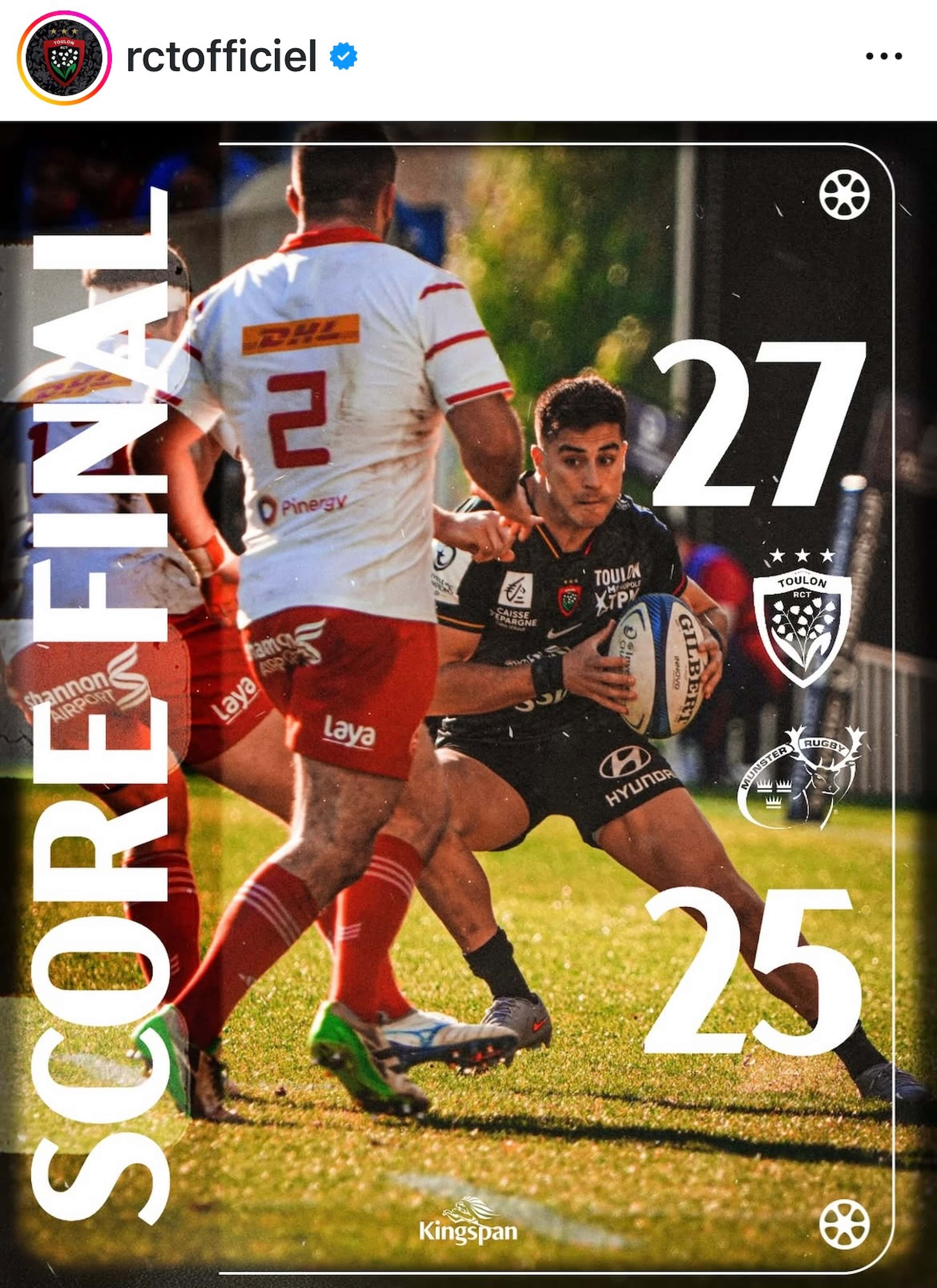 翌日、トゥーロンはホームにマンスター(アイルランド)を迎えた。トゥーロンは、前週、トップ14、ラ・ロシェル戦に、エスポワールの選手9人(内3人はプロ試合初出場)を含む若手主体のメンバーで臨み、0-66という屈辱的な大敗を喫していた。