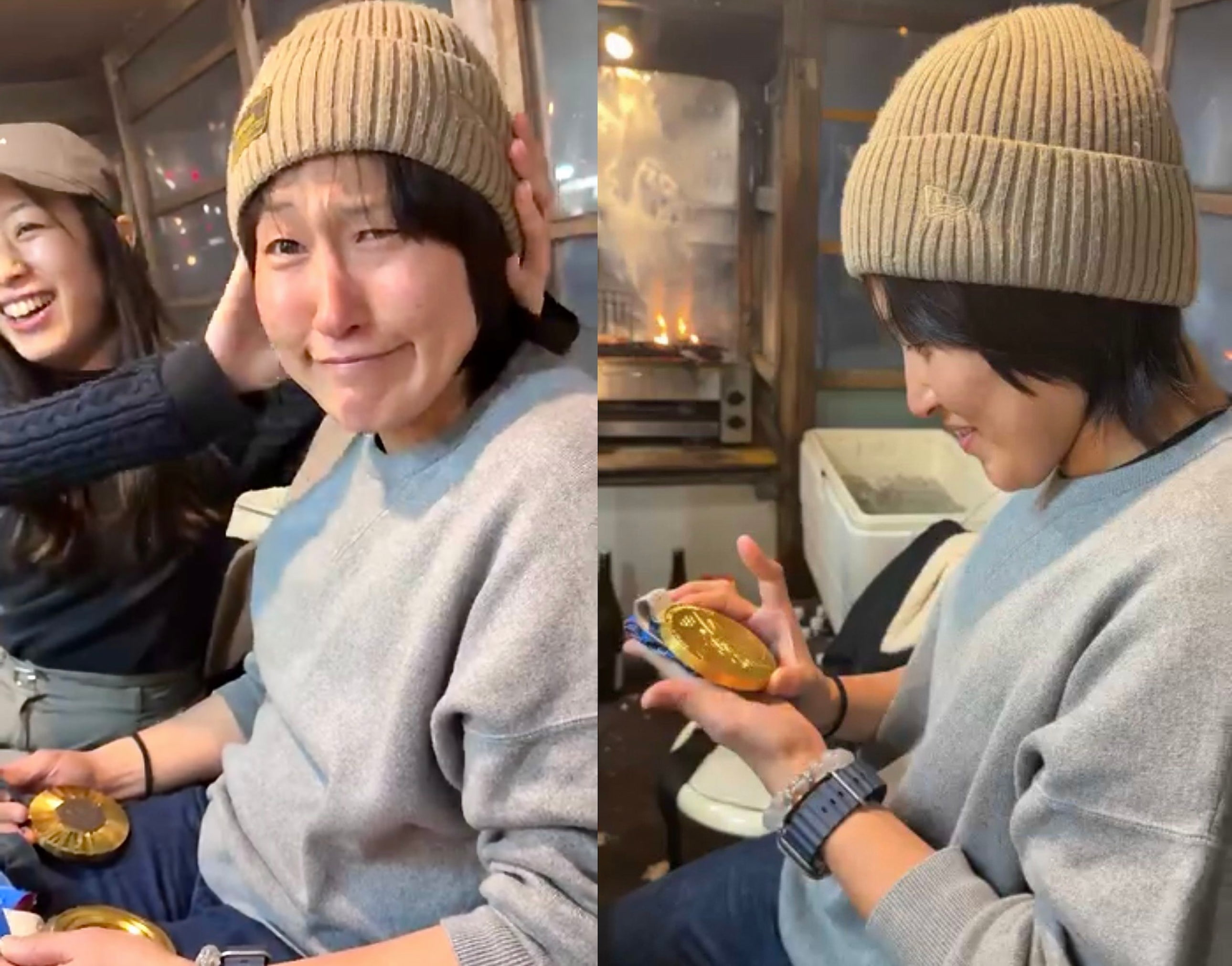 金メダルを触れようとしているこの手は、さっきまで明太子を腹に抱えたイワシの尻尾とか、汁だくのホタテとか、そんなものをつまんでいた手だ(めっちゃ美味しかった)。この日に限ってラグビーボールすら握っていない手である。