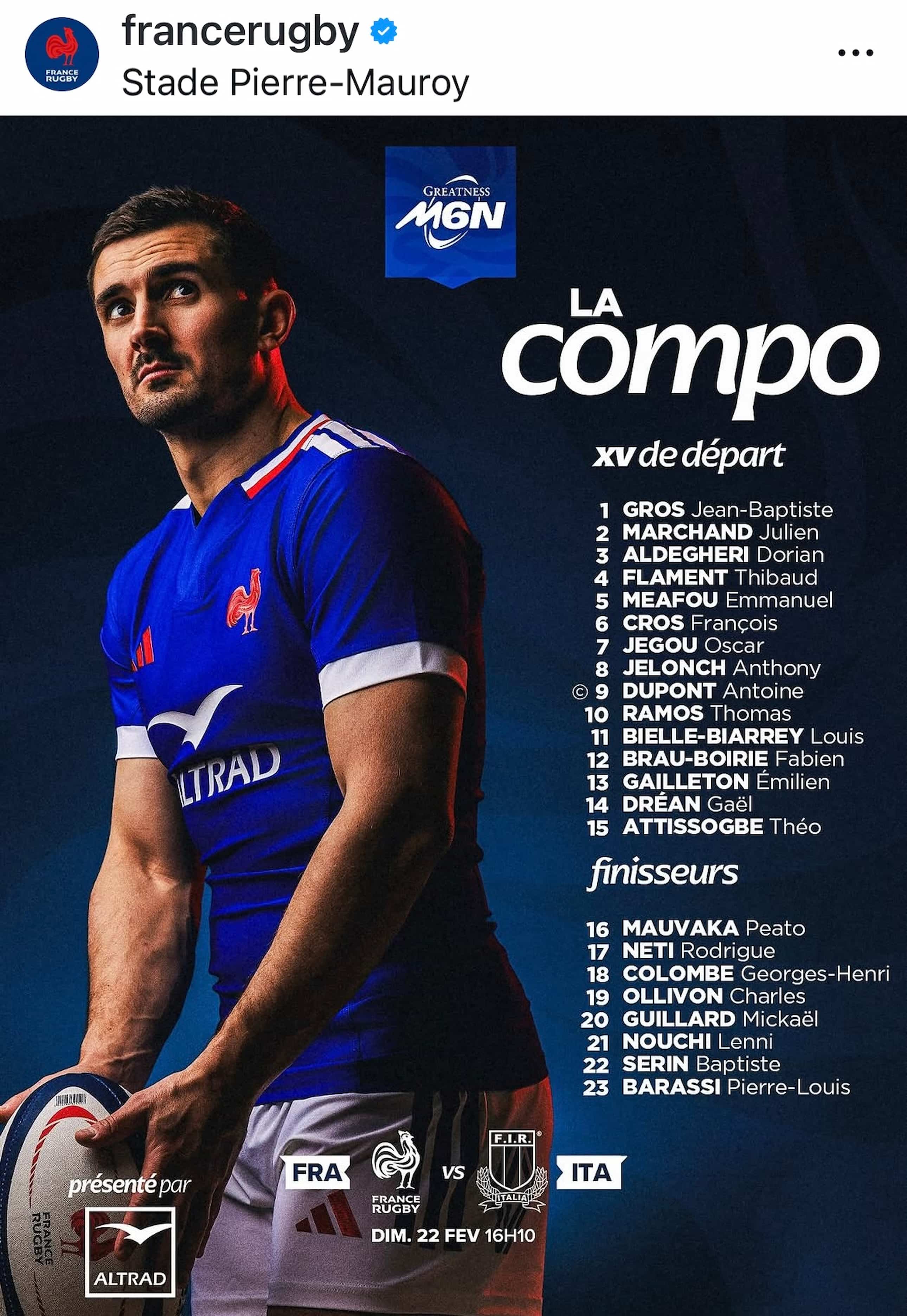 この試合のプレーヤー・オブ・ザ・マッチに選ばれたLOエマニュエル・メアフーは、80分間フル出場で圧倒的な存在感を示した。彼がフランス代表で80分プレーするのは初めてのこと。トゥールーズでも、2024年1月のチャンピオンズカップのマンスター戦に遡る。この試合は「チャレンジだった」とガルチエHCは明かす。