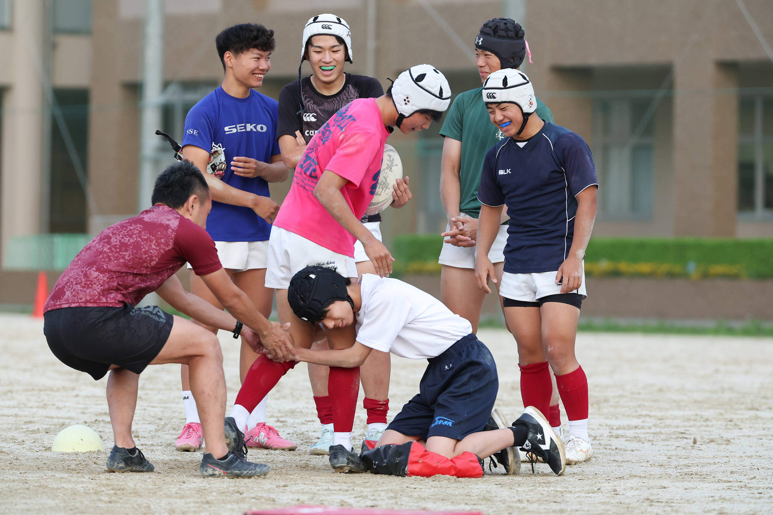 取材に訪れた日も、グラウンドには教え合いの光景があった。スクラムやタックルの基本となる『姿勢』の練習にみんなで取り組む。